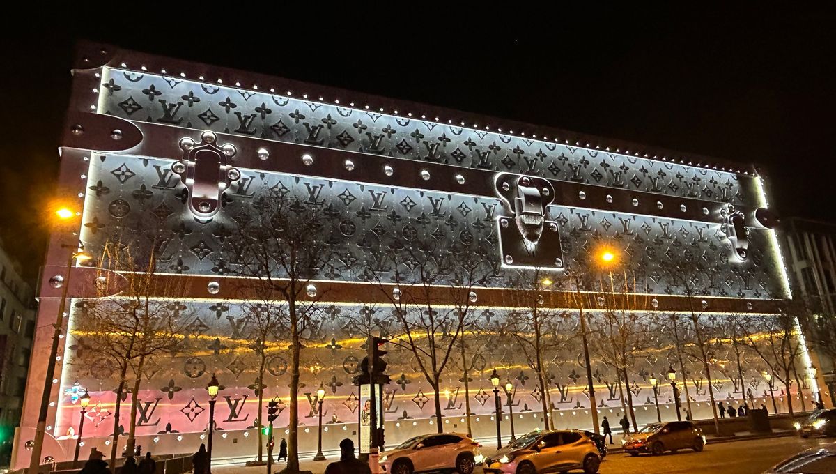 Immanquable à la sortie du métro George V, occupant tout un pâté de maisons, elle est recouverte de logos et de monogrammes « LV » irisés, opalescents le jour et violemment éclairés la nuit. Cet échafaudage grand luxe cache l’énorme chantier des numéros 103-111 de l’avenue, qui devrait accoucher en 2027 du plus grand magasin Vuitton au monde.