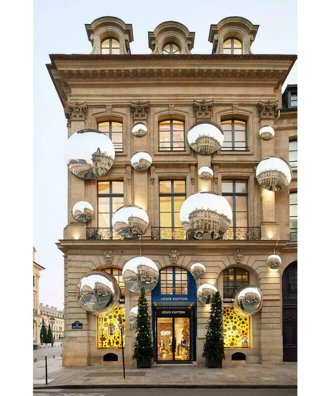 Vuitton a néanmoins immortalisé sa domination dans une édition limitée, où son monogramme est juché sur la colonne de bronze de la place. Sur un bijou de sac, une trousse ou un sac à main, petits objets de cuir aux couleurs pop, la boutique Vuitton porte aussi un immense soleil doré, dont les rayons s’étirent tout le long du bâtiment. Un astre triomphant qui rappelle sans trop se cacher la symbolique du Roi-Soleil, et qui a bien existé : le soleil doré a été installé sur la façade pendant plusieurs mois en 2017, à l’occasion de l’inauguration du magasin.